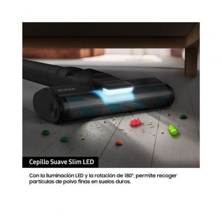 ‘Recoge el polvo fino de los suelos duros con el cepillo Slim LED con ‘iluminación LED para resaltar el polvo en las zonas oscuras. Es más fino’ y ligero, rota a 180° para que sea fácil manejarlo e incluye un rodillo’ antienredos en la parte delantera que reduce la cantidad de cabe
