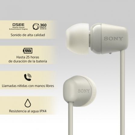 ‘Los WI-C100 reinventan el concepto de auriculares internos inalámbricos.’ Con la calidad de sonido excepcional de Sony, ofrecen una experiencia ‘de escucha increíble con 25 h de batería y un diseño a prueba de ‘salpicaduras para que no te preocupes por nada. Y son compatibles con ‘Sony | Headphones Connect, por lo que puedes ajustar el sonido a tu ‘gusto.