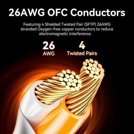 En el corazón del cable Ethernet Cat8 se encuentran sus conductores de cobre libre de oxígeno (OFC) de 26 AWG. Estos conductores de primera calidad están trenzados y cuentan con 4 pares trenzados blindados (SFTP). Esta configuración reduce significativamente la interferencia electromagnética, lo que mejora la calidad de la señal y garantiza que su conexión se mantenga estable incluso durante las horas pico de juego. Para los jugadores, esto se traduce en interacciones receptivas en tiempo real y una ventaja competitiva sobre los oponentes.