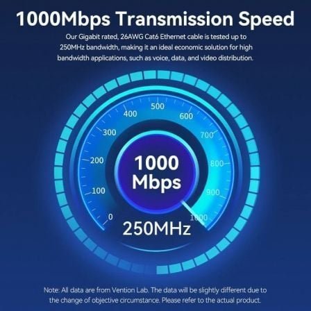 Nuestro cable Caté Ethernet de 26 AWG con clasificación Gigabit ha sido probado hasta Ancho de banda de 250MHz, lo que lo convierte en una solución económica ideal para alta aplicaciones de ancho de banda, como distribución de voz, datos y vídeo.