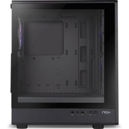 El sencillo diseño de la semitorre Nox Infinity IOTA dispone sus accesos en un panel que se ubica en su lateral, en el que se encuentran dos puertos USB 2.0 y un puerto USB 3.0 de alta velocidad, así como las conexiones de audio.
