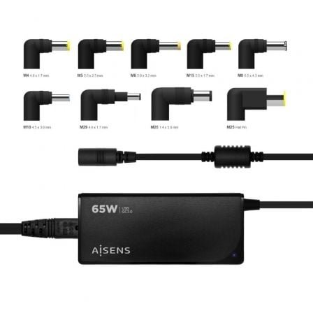 - Cargador 65W automático universal con 9 conectores y USB QC3.0 para cargar portátiles, móviles, cámaras y tablets etc.
