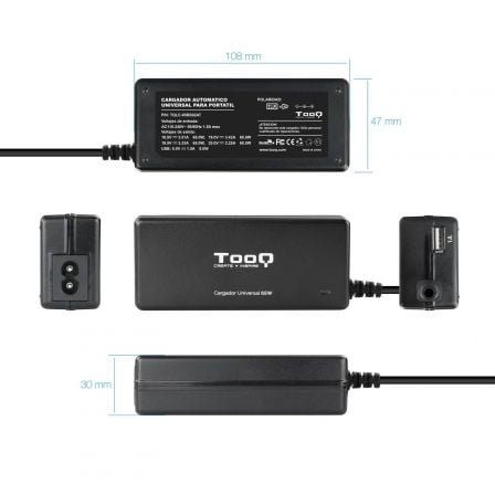 Cargador de portátil tooq tqlc-65bs02at/ 65w/ automático/ 8 conectores/ voltaje 18.5-20v/ 1 usb