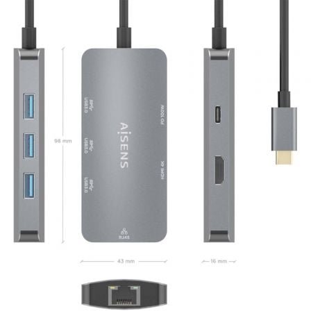 AISENS – USB-C DOCK 6 EN 1, USB-C A 1xHDMI, 1xRJ45, 3xUSB-A, 1xUSB-C PD, GRIS, 15CM