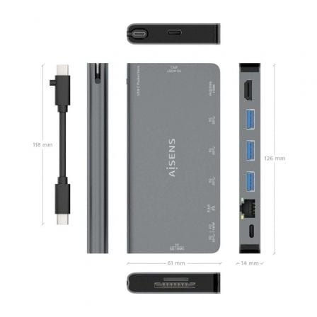 - AISENS – USB-C DOCK 8 EN 1, USB-C A 1xHDMI, 1xRJ45, 3xUSB-A, 1xUSB-C DATOS+PD, 1xSD, 1xMICRO SD, GRIS, 10CM