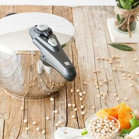 Dispone de dos programas de cocción, 3 sistemas de seguridad a presión y 1 sistema de bloqueo de apertura, cumpliendo con la normativa CE.