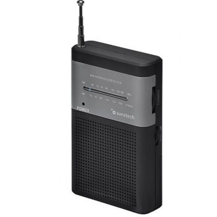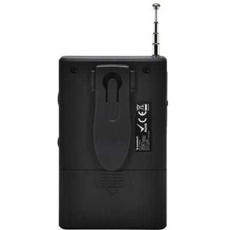 Radio analógica de bolsillo con altavoz, salida para auriculares y antena telescópica.